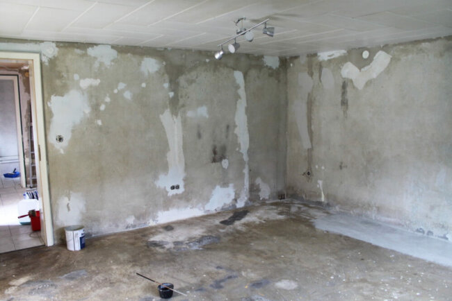Nachdem die Räume endlich getrocknet waren, konnten wir nun endlich mit der Sanierung beginnen. Als erstes mussten 8 Lagen Tapete runter, ein zeitraubendes Unterfangen. Auch musste der alte Fussboden raus.